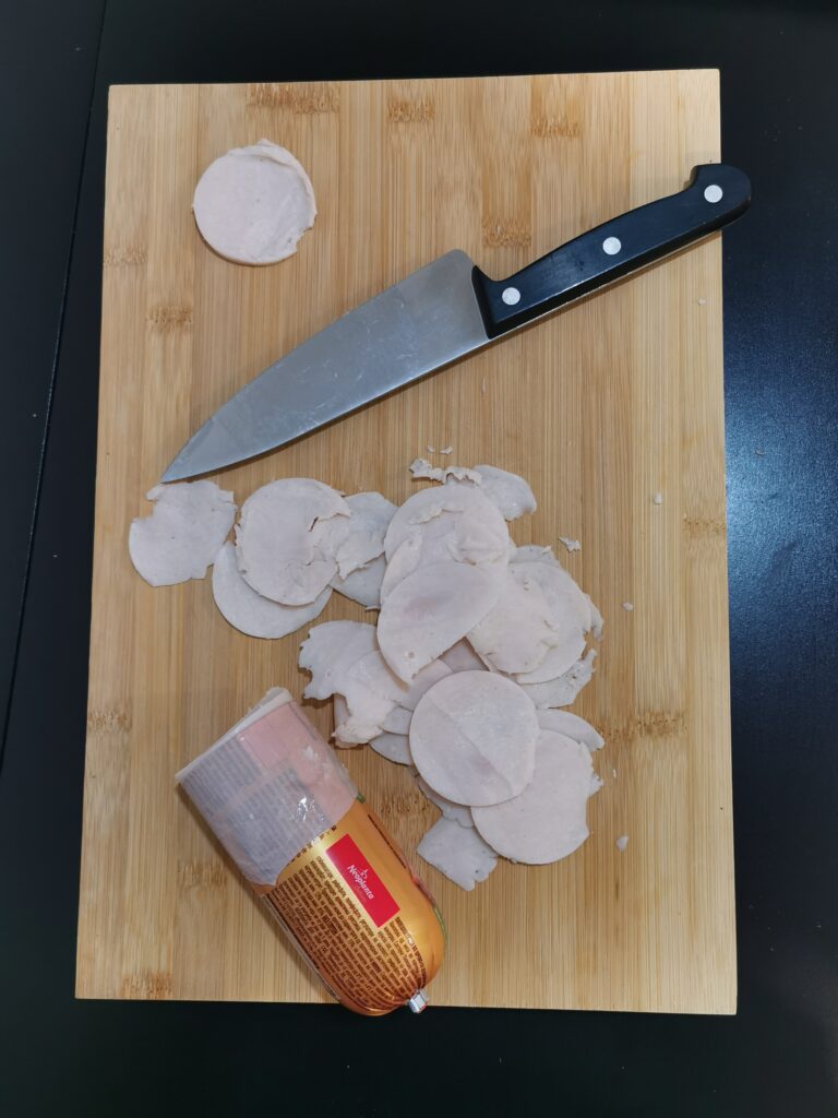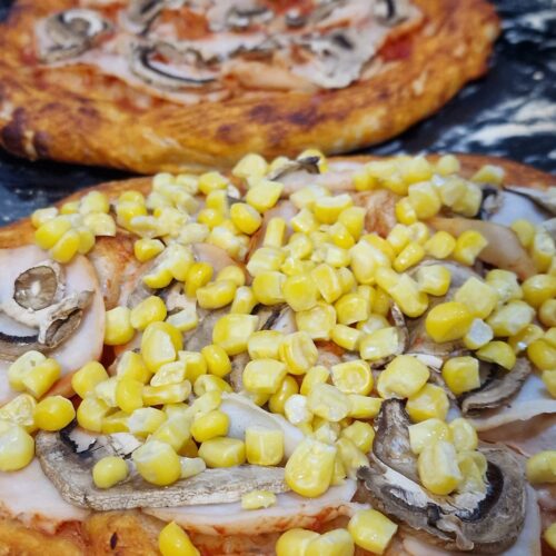 - Take your sliced ham and sliced mushrooms and evenly distribute them on top of the pizza crust.