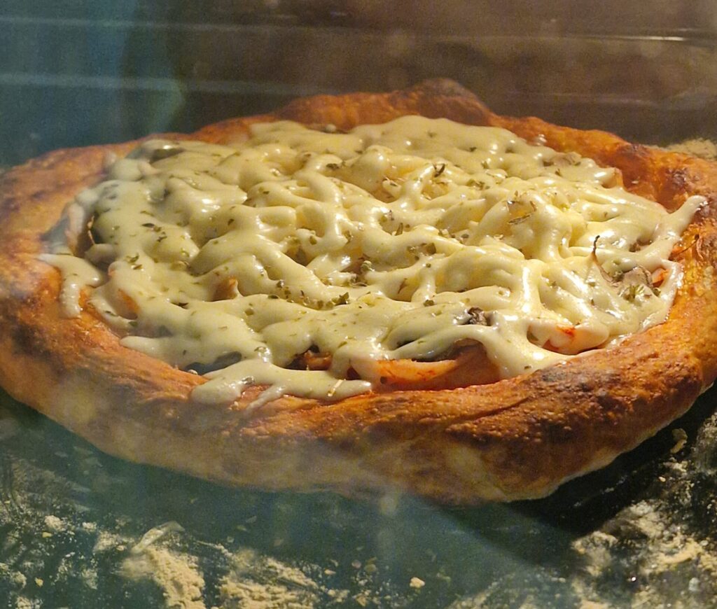 - Take out the pizza and sprinkle your shredded cheese over the ham and mushrooms. After that, put it back in turned off oven and let the cheese melt on the hot pizza for about 2 minutes, just enough time for the cheese to melt.
