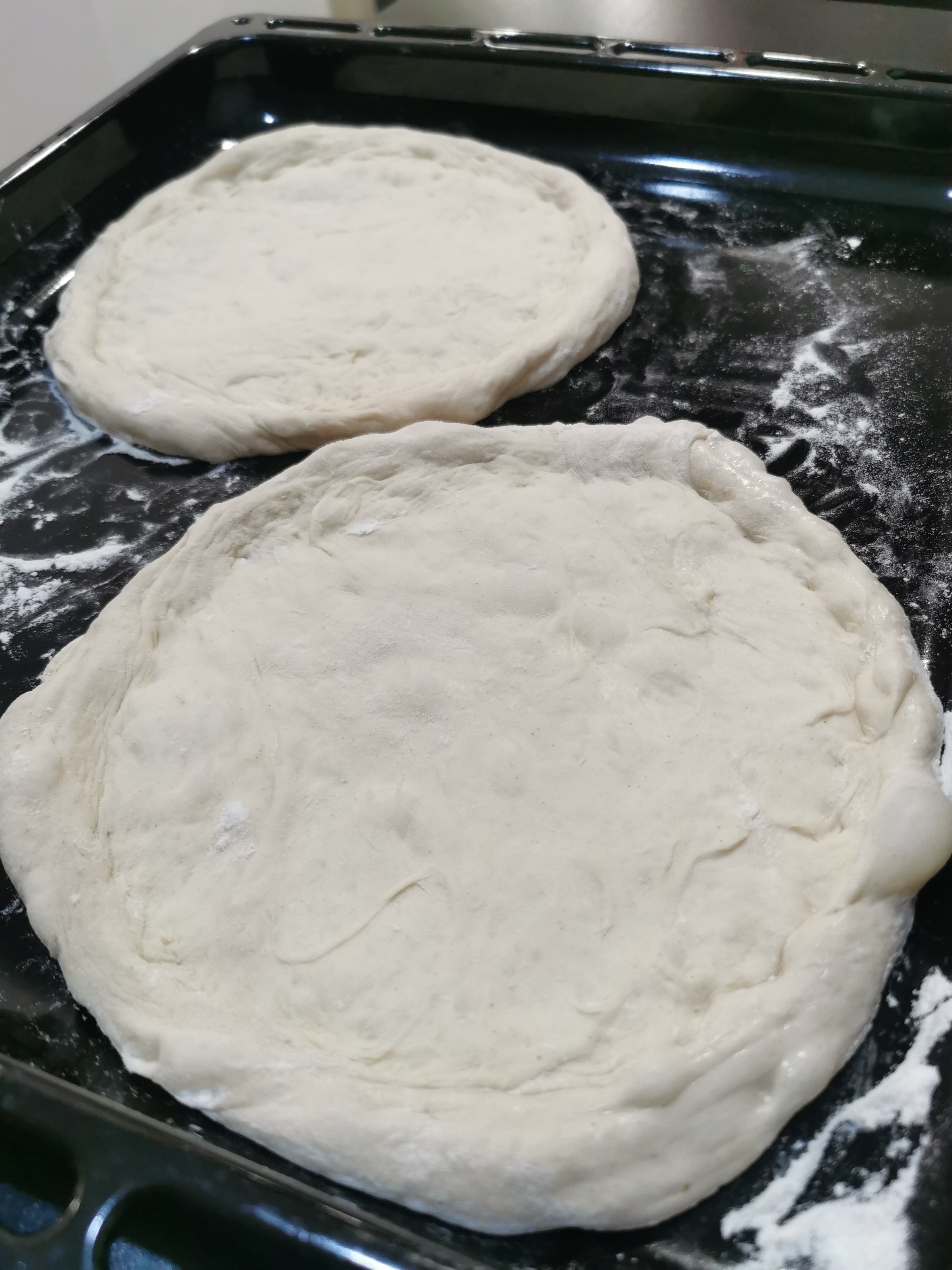 - Roll or stretch the dough out to the desired thickness and shape the dough before adding the toppings.