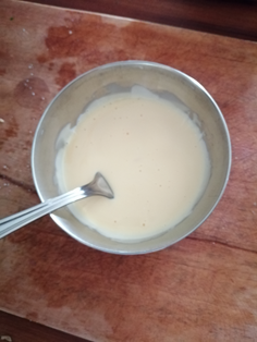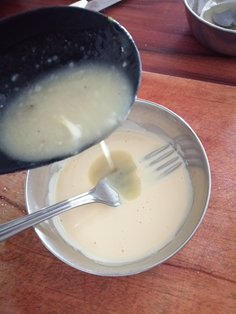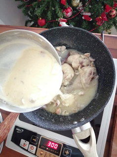 Now it’s time for the French part of the recipe. Add in the yolk and cream (aka the Liaison). This pair finishes your dish and provides it with a smooth creaminess that cannot be achieved through any other means. Special care has to be taken as to not heat the mixture too much. This will result in the egg cooking at too high of a temperature and consequently splitting the sauce. Start by mixing the yolk and the cream together. Ladle in a spoonful of the fricassee sauce (that you put together in the previous step) into the cream and yolk, while mixing the whole time. This action is called tempering your liaison, and it allows the egg to gently come up to a temperature close to the sauce. Once this is done, pour the liaison back into the sauce and immediately turn off the heat and continue stirring. The residual heat will thicken the egg and give your sauce a velvety smooth finish.