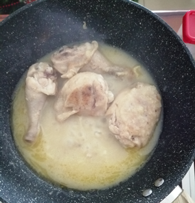 - Place the butter in a sauté pan. Heat very gently. Add the pieces of chicken and cover with a lid.