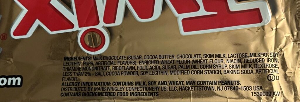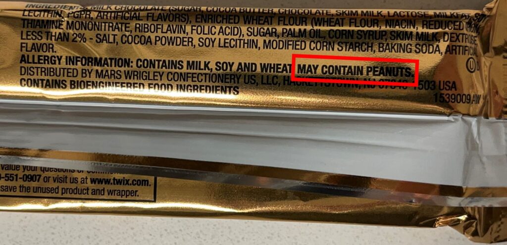 While peanuts are not listed anywhere on the ingredients list, the disclaimer just below the ingredients list claims that Twix bars, “May contain peanuts.”  As stated previously, food allergies can be life threatening.  If you have a known nut allergy, it is best to steer clear of Twix bars. In addition to possibly containing peanuts, Twix bars contain milk and soy, so if you are allergic to either of those things, you should avoid Twix Bars as well.