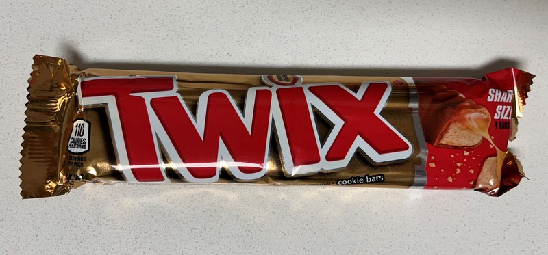 A Twix bar is a chocolate candy bar with a biscuit base, topped with caramel and coated in milk chocolate.