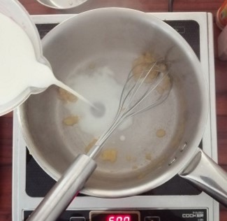 - Heat a medium saucepan and melt the butter. Mix in the flour and combine. Add in the milk and cook until thickened.