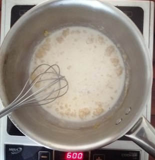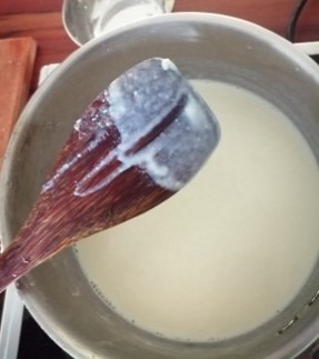 Pour in the milk a little bit at a time, mixing well between each pour. Ensure no lumps of flour remain. Once all the milk is poured, continue mixing until the mixture thickens or until a line drawn on the back of a spoon, stays.