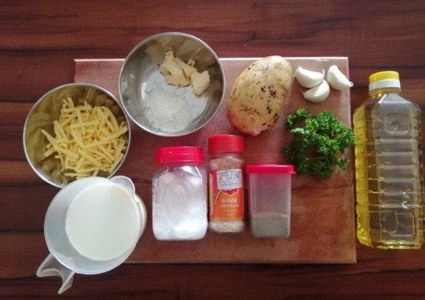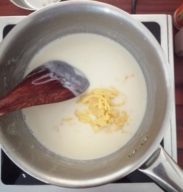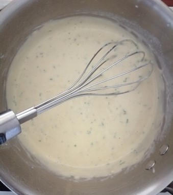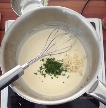 - Grate the cheese into the thickened milk sauce and add in the chopped garlic and parsley and mix till combined. Season with salt and pepper to taste.