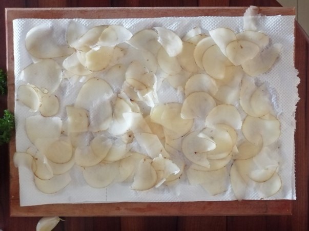 Generally, any potato could be used for this recipe and yield a chip with an excellent crunch. But the best potatoes to use would be either Yukon Golds or Russets due to their perfect starch content. Once properly washed, slice the potatoes as thin as possible. The easiest way to do this, which would give the most consistent results, is to use a mandolin. But be careful and make sure your fingers are well out of the way as you slice!