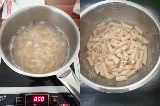 - Boil the pasta in salted water and drain. Save the pasta water.