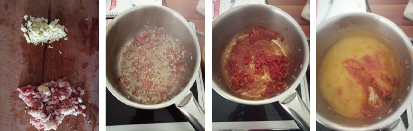 - Sauté the bacon until golden and crispy. Add in the chopped garlic and sauté.