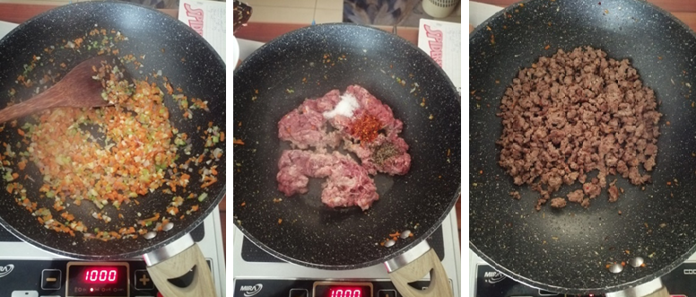 When the prep work is done, heat a pan or wok with a little oil and add in all the vegetables leaving out the bay leaves and celery, which will be added in later. Once the vegetables are translucent (about 5 minutes), remove them from the pan and add in a tad more oil. Then, drop in the ground beef. Add in your seasonings and allow to cook, without stirring, until the beef develops some color. Next, mix together well and cook on high heat until the beef develops that same caramelization all over.