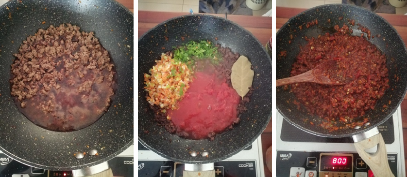 Pour in the red wine and reduce the heat, and allow the wine to reduce as well. Once this is achieved, add in all the remaining ingredients including the cooked vegetables, and combine. Keep the sauce on a medium to low heat and allow to reduce till thick. Season the sauce and correct if needed.