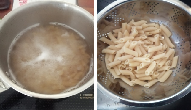 - Boil the pasta in salted water and drain. Reserve the pasta water.